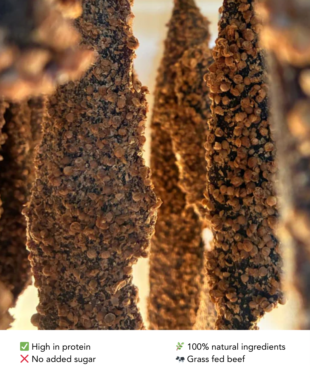 A tender, air-dried South African style protein snack made from premium Argentinian and Uruguayan beef: bold, clean, and crafted for peak freshness.